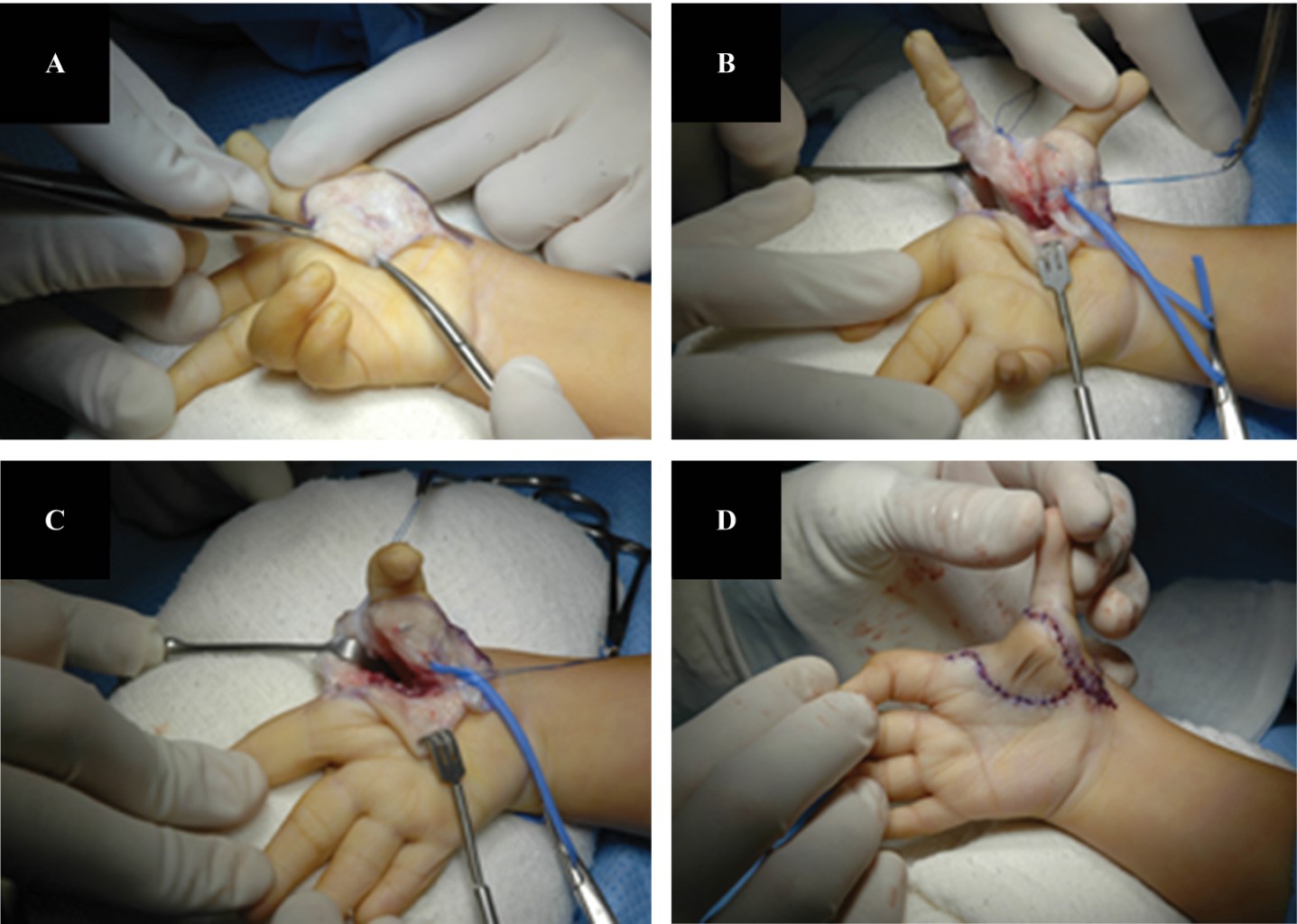 After an informed consent by the parents of the patient, surgical treatment was decided on, in 2 surgical times 6 months apart, which consisted of bilateral pollicization using the principles described by Buck-Gramcko8 for the reconstruction of the thumb keeping the more functional accessory radial finger and a transfer of the intrinsic muscles. The surgical technique is described below, which was the same in both surgical times.