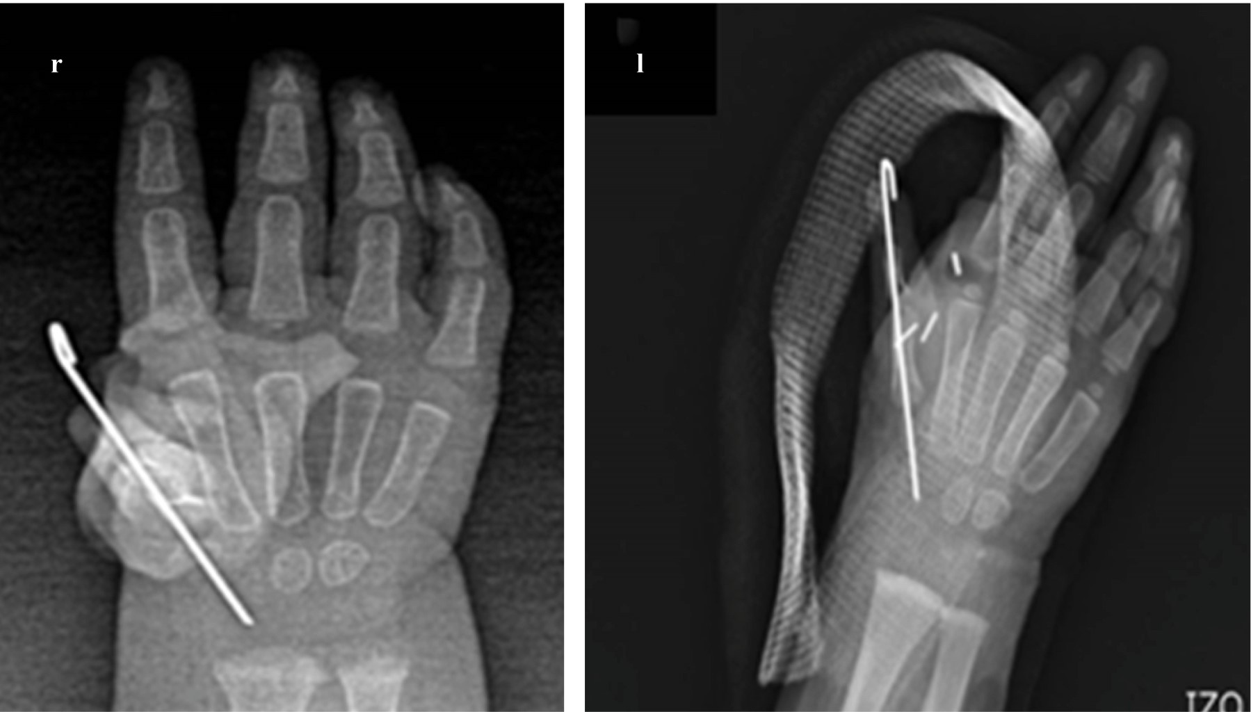 This rare malformation of both hands presented great surgical challenges. Primary reconstruction, particularly pollicization, must be done as soon as possible.3 And hope that it is not necessary to make additional corrections, referring to the function of the elbow and wrist, which in this case had no congenital malformation. Temporary immobilization by a Kirschner wire in the metacarpophalangeal joint is a valuable way to achieve a correct position of pollicization.