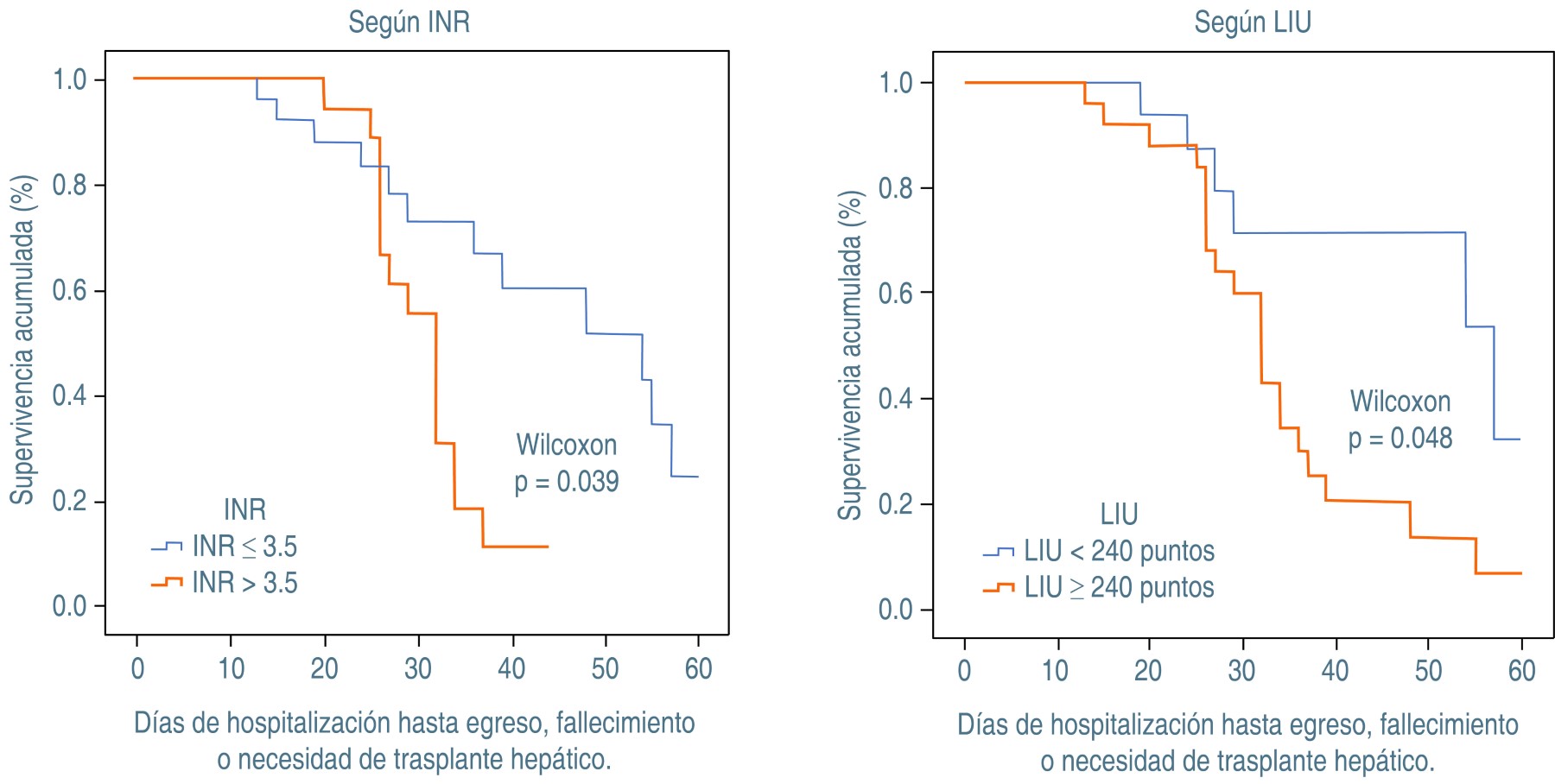 Results: 44 patients were included. In the majority, the etiology of ALF could not be identified (56.8%). Fifteen patients (34.1%) had a favorable evolution, and 29 (65.9%) had a poor evolution: 15 died and 14 met LT criteria. In the multivariate model, the poor prognostic factors were: INR (international normalized ratio) > 3.5 (HR = 2.235; 95% CI: 1.722-6.914; p = 0.043) and a higher LIU score (Liver Injury Unit scoring system) (HR = 2.0; 95% CI: 1.996-2.005; p = 0.049).