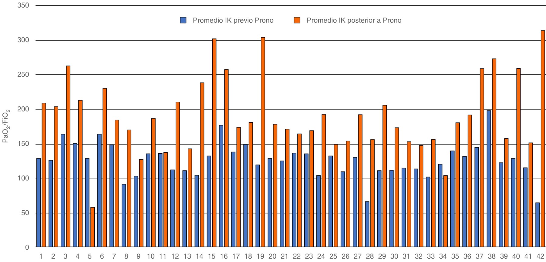 At the end of 2019, a new species of coronavirus identified as SARS-CoV-2 emerged, with the ability to cause disease in humans, defined as COVID-19. As of March 2020, cases of SARS-CoV-2 pneumonia began to appear at the Hospital Español de México, some of these patients developed severe disease requiring invasive mechanical ventilation. A descriptive, cross-sectional, retrolective and analytical study of cases was conducted from May to August 2020, in patients admitted to the COVID intensive care area at said hospital. A sample of 42 patients was obtained, 32 (76%) men and 10 (24%) women, with severe pneumonia due to SARS-CoV-2 and refractory hypoxemia with a picture of acute respiratory insufficiency syndrome (SIRA) from moderate (PaO2/FiO2 < 200) to severe (PaO2/FiO2 < 100), which required invasive mechanical ventilation and for refractory hypoxemia at least one event in the prone position. The minimum duration of each prone episode was at least 24 hours, with a minimum of one decubitus and prone events and a maximum of seven events, with a global average of 2.7 prone events. The maximum prone time per event was 36 continuous hours, with an average of 30.1 hours in the prone position. It was possible to establish that patients in the prone position presented an improvement regarding the oxygenation index (PaO2/FiO2) with a p < 0.01, unlike other characteristics such as PaO2 and PaCO2, where not enough evidence was found with regard to being a predictor of mortality and gravity.REFERENCES