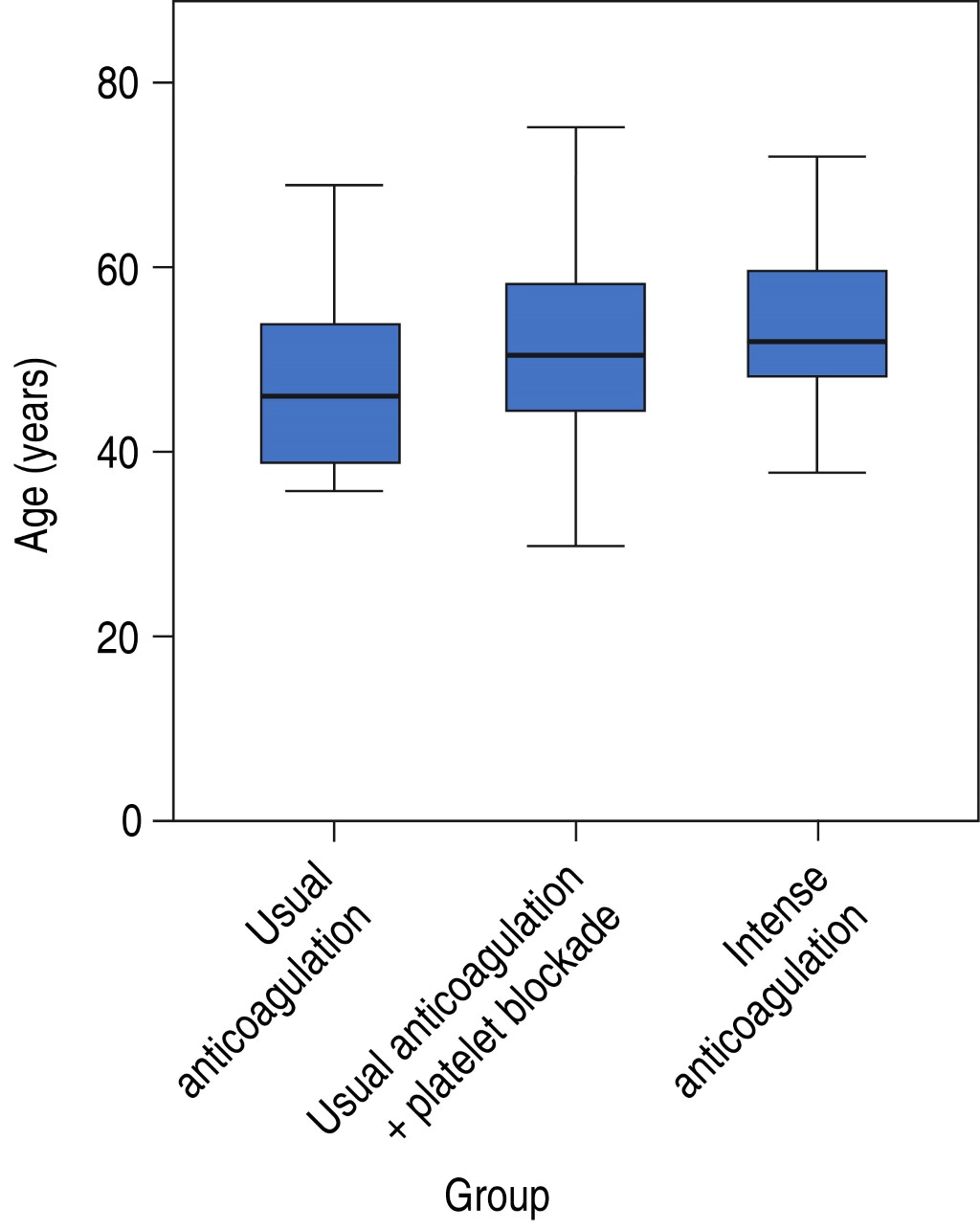 The lymphocyte count was normal in the usual anticoagulation and anticoagulation plus platelet blockade groups; below 1,100 mm3 in the intense anticoagulation group (Figure 4).