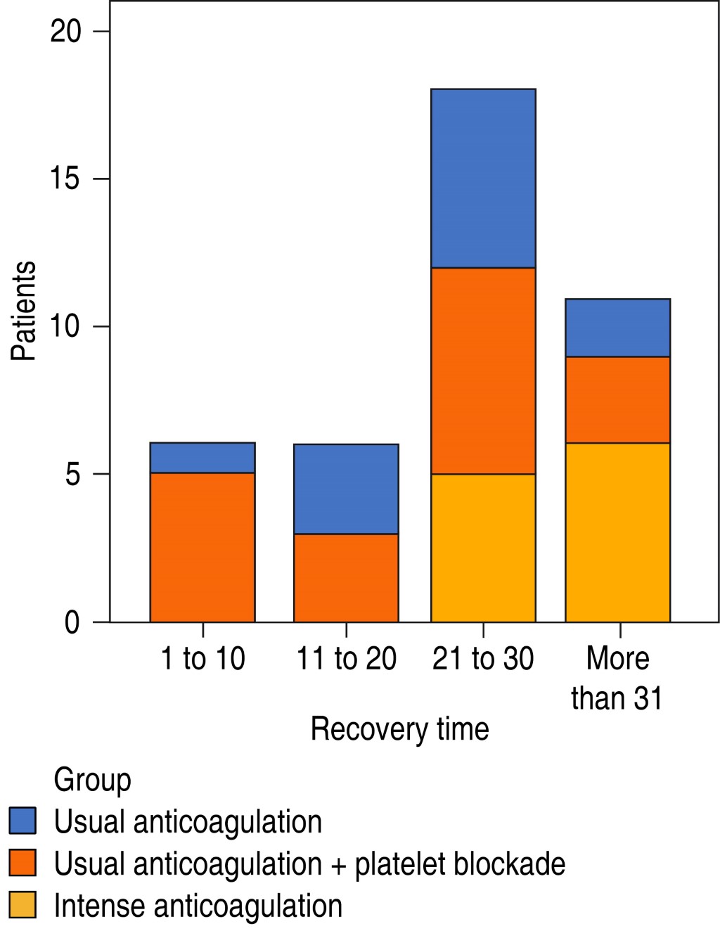 The Figure 2 shows the recovery time in the different groups. All the patients received ambulatory treatment; all with moderate to severe disease, tolerated the oral anticoagulation and showed faster recovery; only one patient presented mild sub-conjunctival hemorrhage.