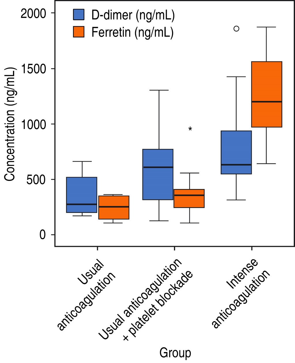 The analysis included 41 patients, from a group of 300 with a recent diagnosis of SARS-CoV-2 infection. The Table 2 summarizes three different allocation groups: The group with intense anticoagulation consisted of 12 patients, the usual anticoagulation plus platelet blockade group with 18 patients, and in the usual anticoagulation group, with 11 patients; 92.6% of the patients received rivaroxaban and the rest apixaban.