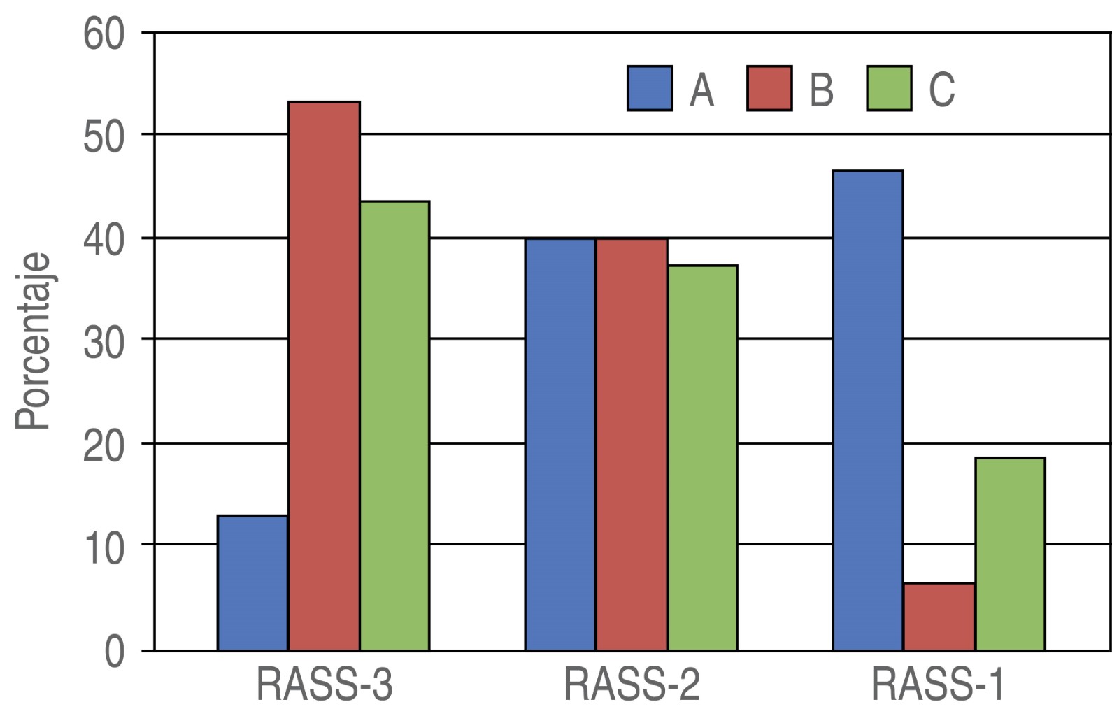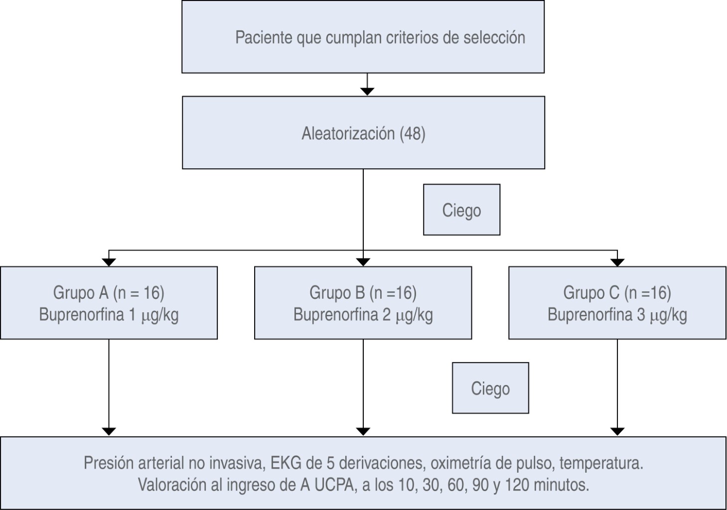 Material and methods: We conducted a double-blind, prospective, transversal study, in 48 patients which underwent a thoracoscopy divided in 3 groups: A (1 μg/kg), B (2 μg/kg), and C (3 μg/kg) treated with buprenorphin. We studied side effects, pain intensity (NVE), and sedative effect (RASS) from 0 to 120 minutes postanesthesia.