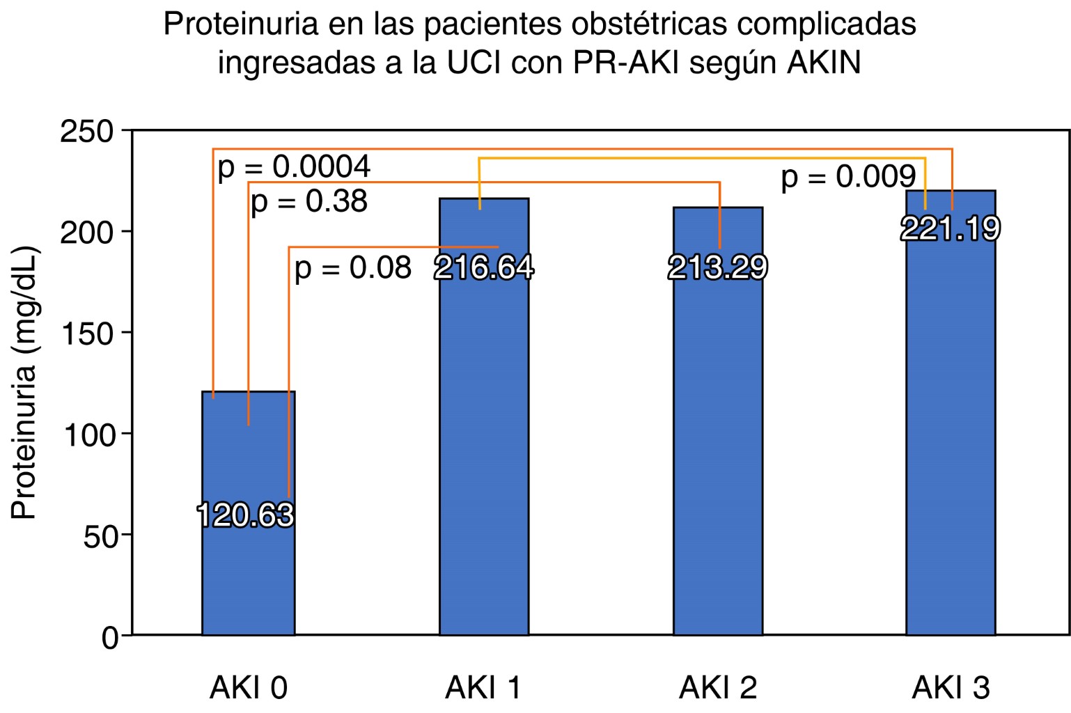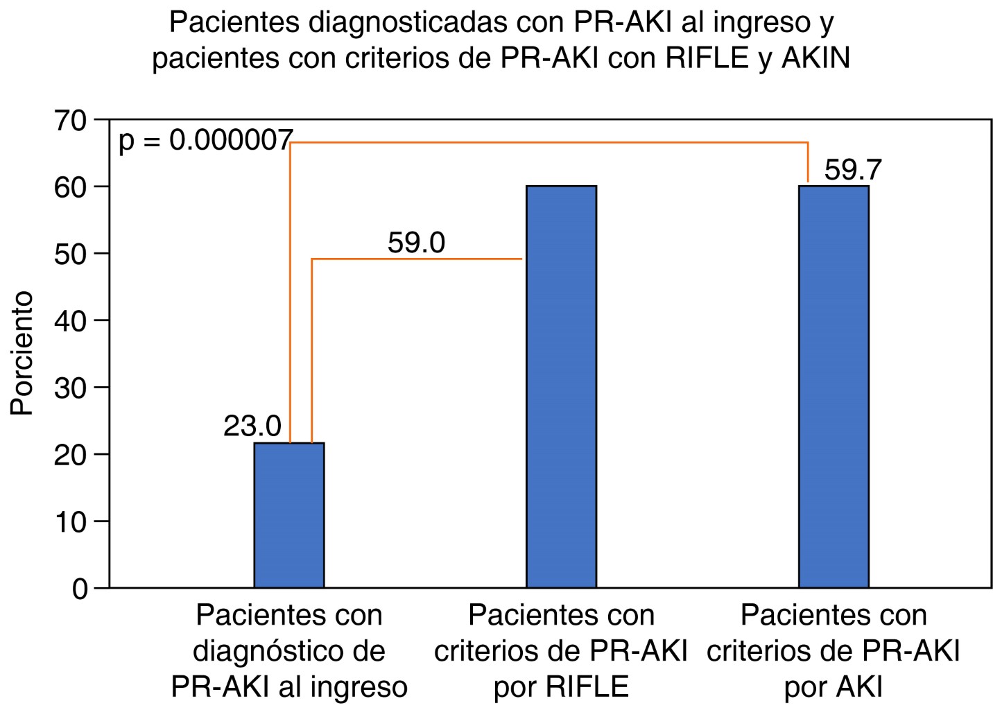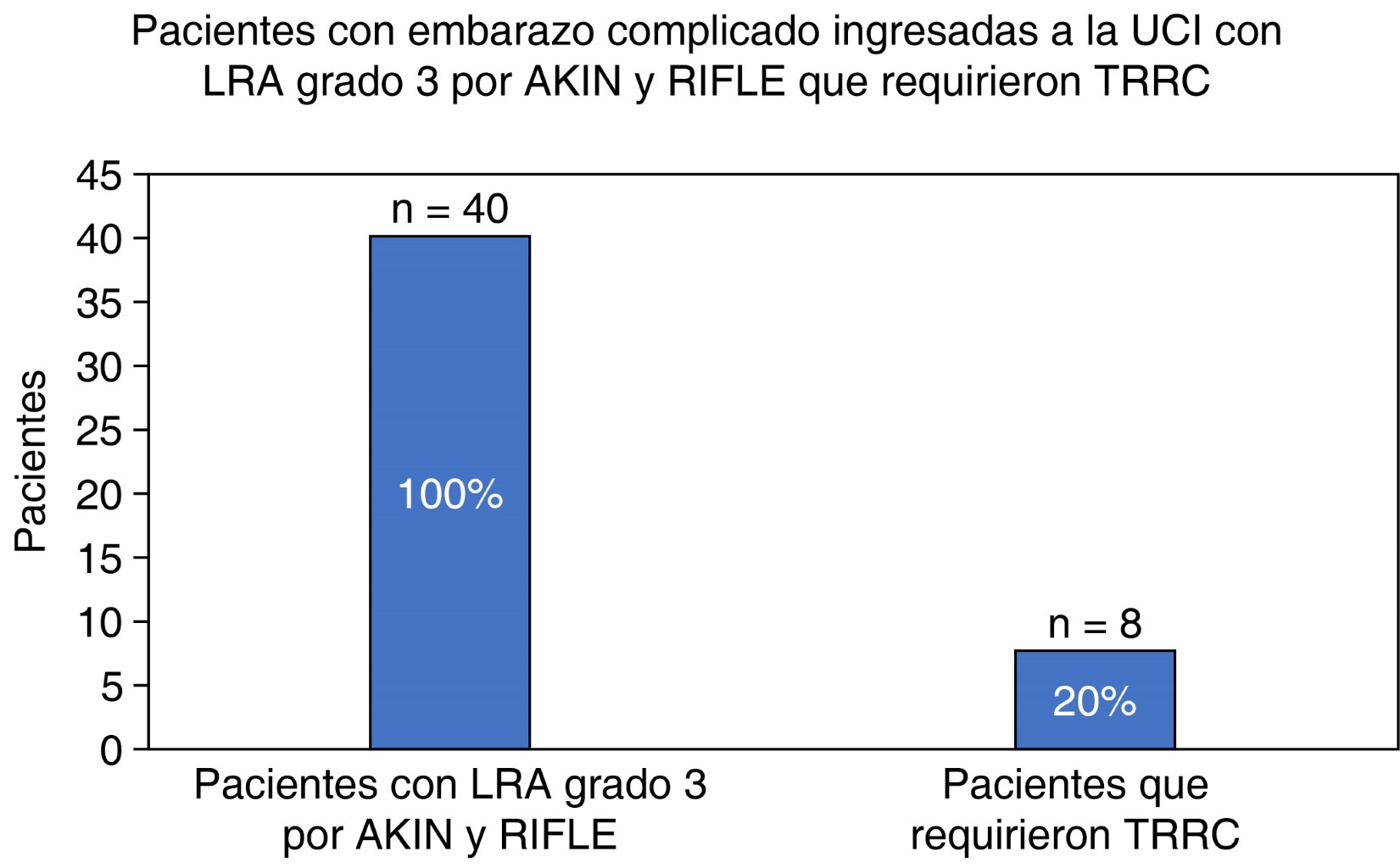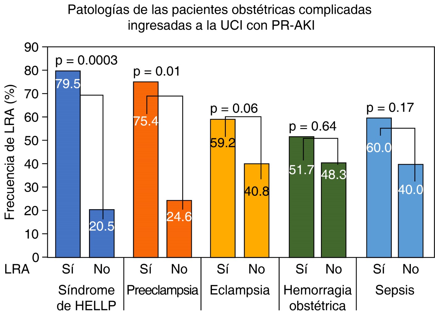 Objective: To define the prevalence and associated factors of acute renal injury in pregnancy (PR-AKI) in the Intensive Care Unit (ICU) of the Women's Hospital, Morelia, Michoacán, Mexico. Material and methods: Retrospective, cross-sectional and descriptive study from January 2013-August 2018. Ambit: Intensive Care Unit of the Women's Hospital. Patients: We reviewed 213 files of complicated obstetric patients. Inclusion criteria: complicated obstetric patients that merit admission to the ICU, patients who met criteria for LRA. Exclusion criteria: patients with chronic. Main variables of interest: Complicated obstetric patients (preeclampsia, eclampsia, HELLP syndrome, hemorrhagic shock and sepsis). It was investigated if they developed PR-AKI. Results: 154 complicated obstetric patients were included; an average of 25.6p ± 1.6 per year. 36% had a diagnosis of eclampsia; 35.3% pre-eclampsia; 29.3% HELLP syndrome; 19.3% obstetric hemorrhage, 10% sepsis. Association of PR-AKI with HELLP syndrome (p = 0.0003) and pre-eclampsia (p = 0.01) was demonstrated. A subdiagnosis of 36.7% was found when searching for PR-AKI using the RIFLE and AKI criteria (p = 0.000007). Of the patients with PR-AKI grade 3, 20% required continuous renal replacement therapy. Conclusions: Renal injury associated with complicated pregnancy has a prevalence of 6.7%. The complications that most develop PR-AKI are HELLP syndrome and preeclampsia. PR-AKI is underdiagnosed.REFERENCES