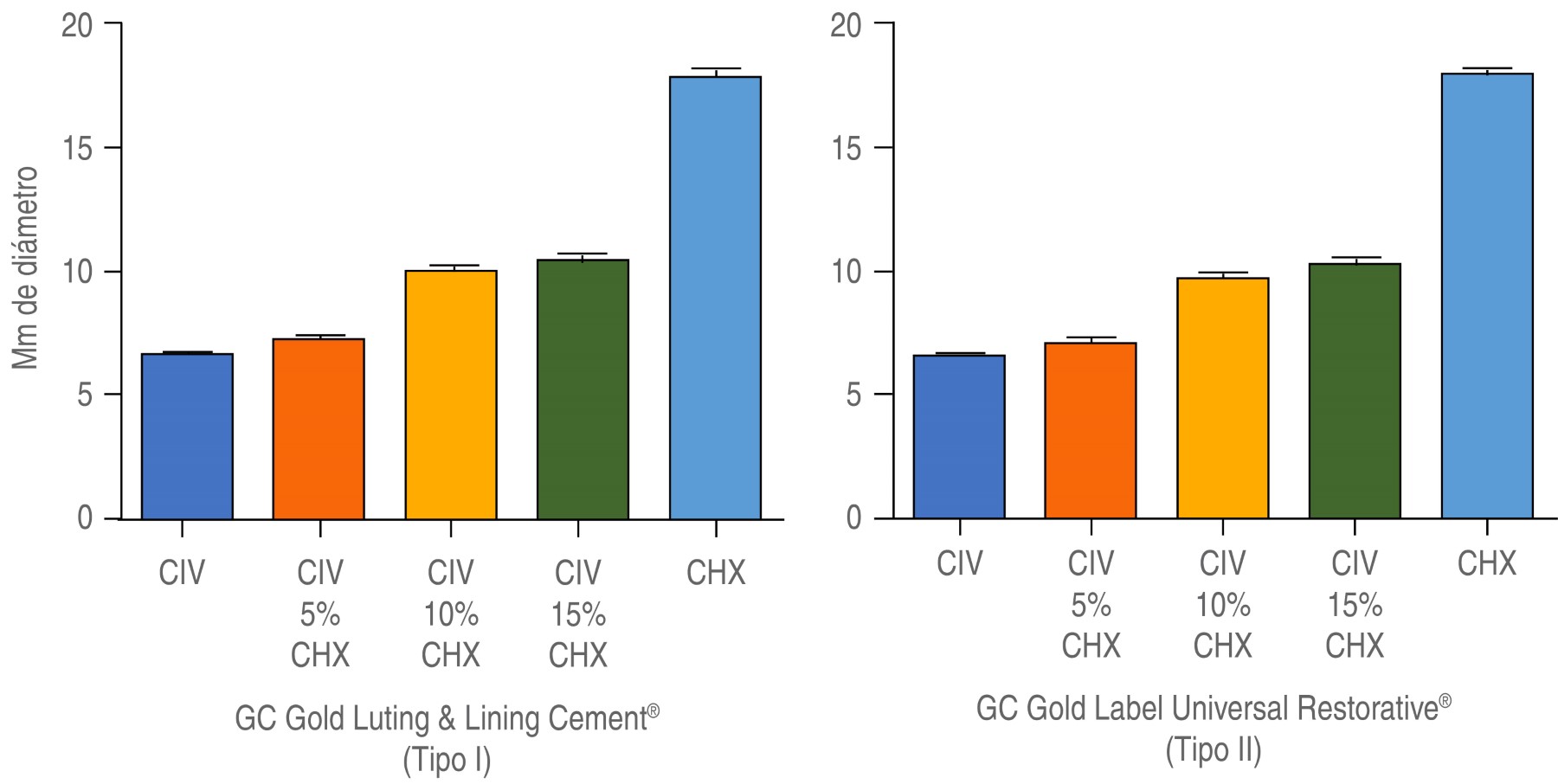 In this research, the GICs type I GC Gold Luting & Lining Cement® and type II GC Gold Label Universal Restorative® were used in strict preparation, as indicated by the manufacturer and with the incorporation of CHX at 0.2% (Viarclean-up®) in different proportions, an antibacterial effect was obtained that increased as the proportion of CHX increased. This is consistent with previous reports by Botelho11 and Ribeiro14 but not with Jedrychowski15 or Takahashi.19