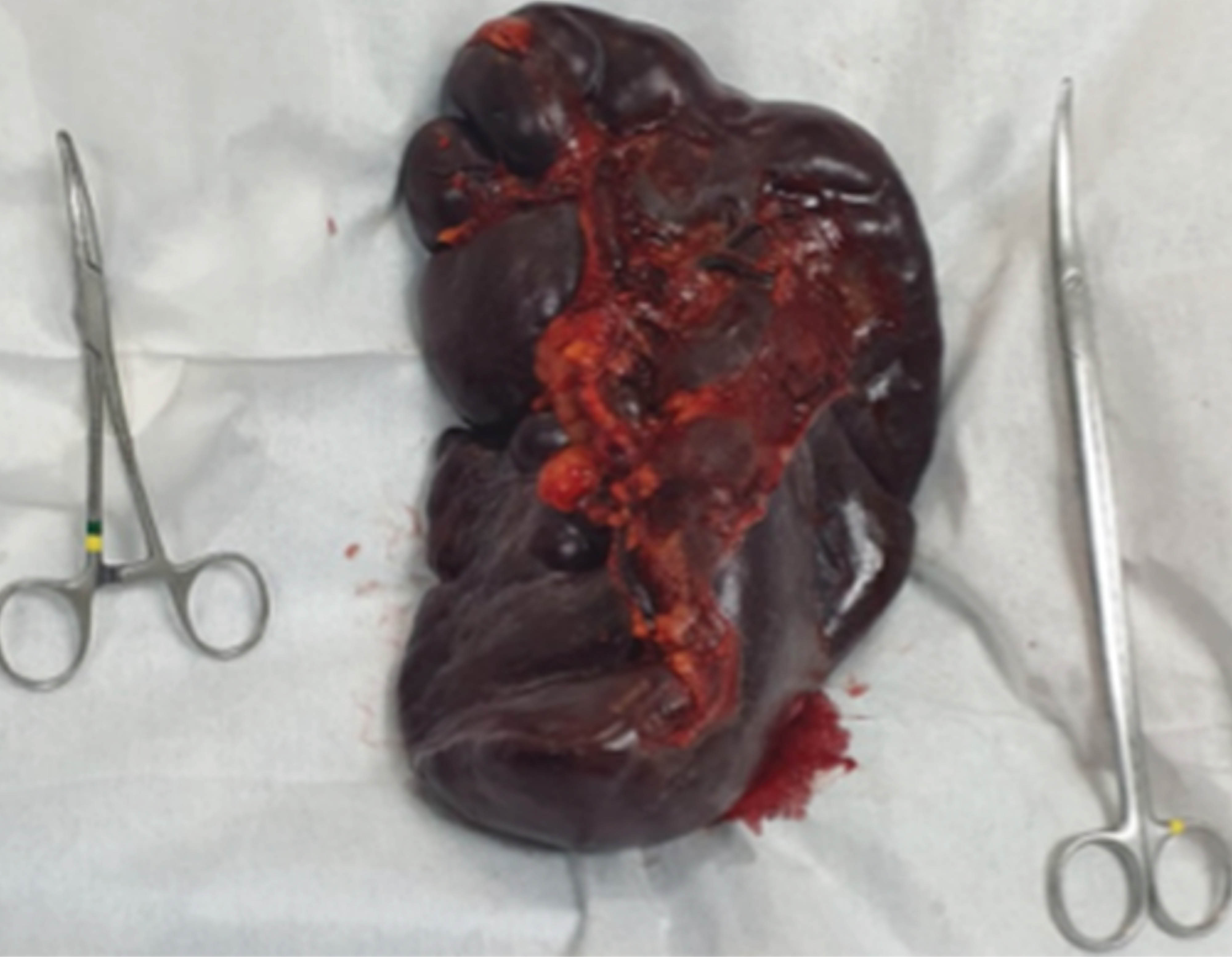 3. Hand-assisted laparoscopic approach is performed through 3 ports; vascular control with endostapler, finding a 25 × 15 × 10 cm spleen.