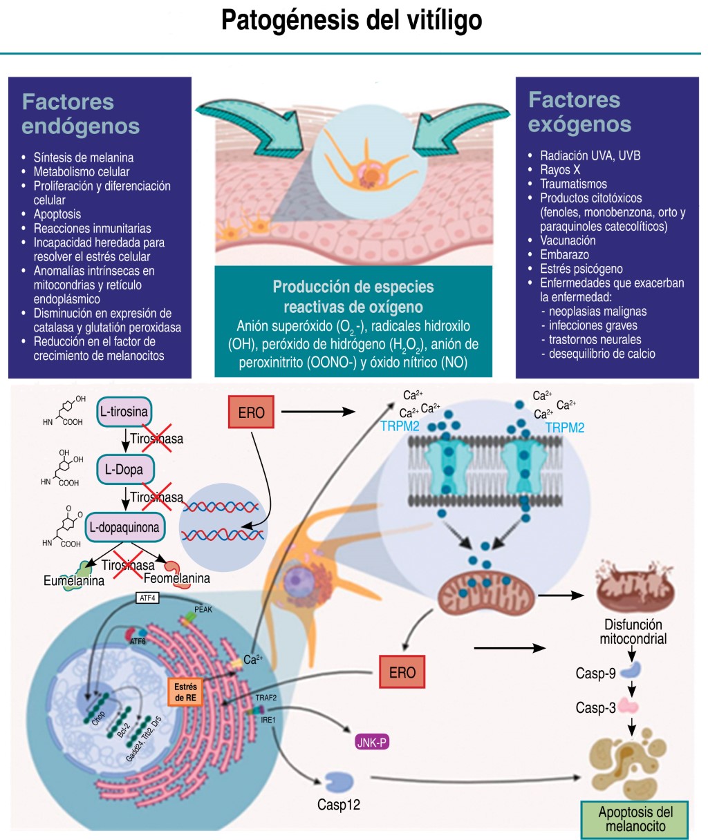 Vitiligo is considered the most frequent acquired dyschromia, causing 2 to 4% of the dermatological consultation in Mexico, being this one of the countries with the highest incidence. Understanding the mechanisms by which melanocyte loss occurs is a fragmented approach, it is a complex, multifactorial disorder, the same causal mechanisms cannot have problems in all cases, and different pathogenic mechanisms can work together, the present work has as its objective to show the overall picture that it has regarding the immunological theory of vitiligo, intrinsic and extrinsic triggers are addressed, cellular processes, participation of reactive oxygen species, participation of the immune system and its relationship with other diseases. The genetic and environmental bases that have been seen to interact in the death of melanocytes are also included, and information is collected on the different lines of research in which work continues to learn more about the pathogenesis of this disease.