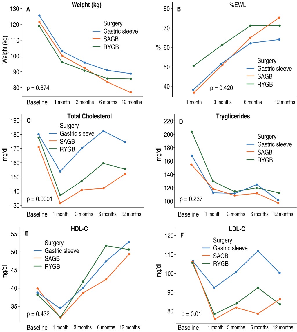 An observational, longitudinal, and analytical study approved by the institution's research committee with registration number DIR/19/310B/3/006 was carried out, where patients undergoing bariatric surgery at the Comprehensive Care Center for Diabetes and Obesity (CAIDO) of the General Hospital of Mexico in the period from January to December 2016 were evaluated. Patients taking hypolipidemic drugs or with metabolic syndrome were excluded. The indication for the type of surgical procedure (gastric sleeve, Roux-en-Y gastric bypass [RYGB] or single-anastomosis gastric bypass [SAGB]) was based on clinical criteria and on the consensus of the different specialists at the clinic. All patients were evaluated preoperatively and at one, three, six and 12 months postoperatively. During each visit weight, BMI, % of excess weight lost (%EWL) and biochemical tests for total cholesterol (TC), high-density lipoprotein cholesterol (HDL-C), low-density lipoprotein cholesterol (LDL-C) and triglyceride (TG) levels were measured.