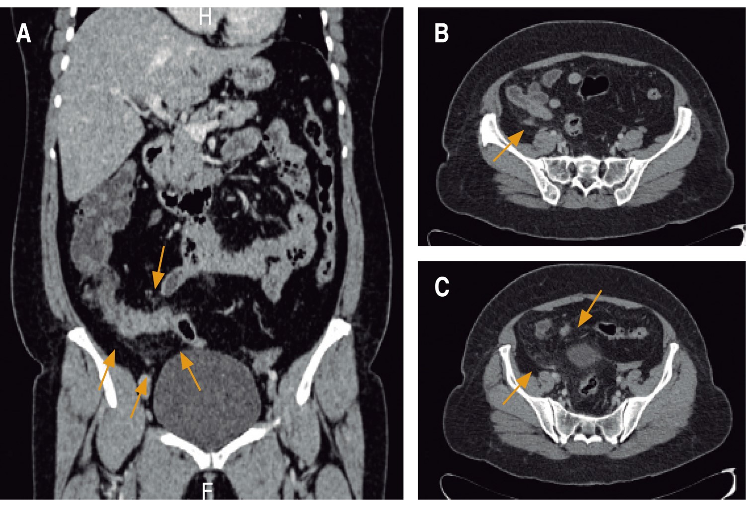 Physical examination revealed abdominal pain on deep palpation in the right iliac fossa with positive McBurney's point, and obturator, psoas, and Von Blumberg's signs. She also had positive right upper and middle ureteral points and right Giordano sign. Complete laboratory tests, including blood cytology, blood chemistry, and acute phase reactants were requested. The only important findings were leukocytosis with neutrophilia of 94% and C-reactive protein of 4.3 mg/dl. An abdominal CT scan with intravenous contrast was performed (Figure 1) that showed inflammatory changes of peri-colonic fat on the right side, and no identification of the cecal appendix.