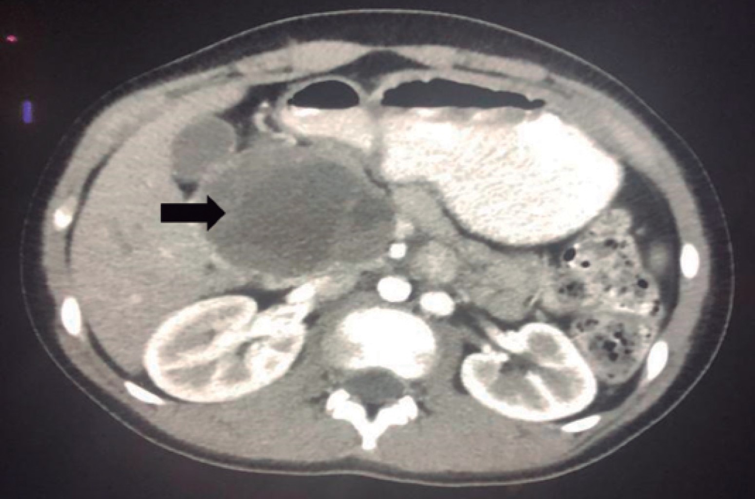 Imaging studies were performed including an abdominopelvic ultrasound study that showed a retroperitoneal heterogeneous tumor lesion with cystic areas in the vicinity of the head of the pancreas measuring 6 × 10.1 cm above the adrenal area. A computerized tomography (CT) scan of abdomen and pelvis simple and with intravenous contrast was performed showing evidence of a septate heterogeneous tumor lesion with contrast uptake in the periphery and septa, and presence of cystic areas of lower density located in the head of the pancreas of well-defined contours measuring 5. 9 × 6.7 × 7 cm. The pancreas body and tail were without alterations, and no dilatation of the duct of Wirsung, without presence of obliteration of the perivascular fat in the superior mesenteric artery or the spleno-portal axis, nor evidence of retroperitoneal adenomegaly were seen (Figure 1).