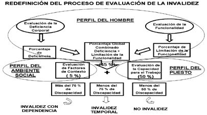 Este nuevo modelo propone que si se tome en cuenta al perfil del hombre, pero caracterizado por un porcentaje combinado de deficiencia corporal global y de limitaciones funcionales para la participación social al que se la ha dado un peso del 45 % de la capacidad para trabajar; para la evaluación de este perfil se utiliza un baremo denominado “Valoración de las situaciones de minusvalía”, elaborado por el Instituto de Mayores y Servicios Sociales (IMSERSO) de España, con el cual se obtienen porcentajes de deficiencia corporal global por los padecimientos del asegurado y una cédula en la que se ponderan grupos de actividades de participación social, entre los que se encuentran el auto cuidado personal, participación en interacciones y relaciones interpersonales, participación en áreas principales de vida como el trabajo y la educación, participación en vida doméstica y participación en vida comunitaria, social y cívica.